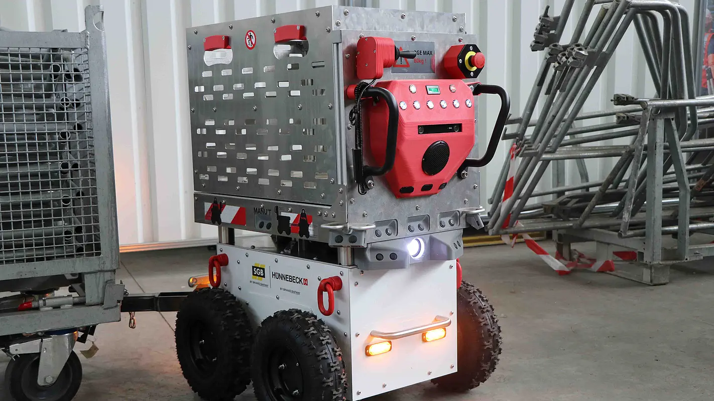 Certifié CE, MANU’T évolue en toute sécurité. Munis de ses nombreux capteurs, il détecte entre autres les obstacles, les vides, et bien évidemment les personnes. En mode suiveur, MANU’T analyse la physionomie complète de la personne ayant enclenché le mode. Elle peut ainsi se placer de face comme de dos, sans aucun problème. Si une autre personne venait à se positionner entre MANU’T et la personne suivie, notre robot s’arrêterait, et ne redémarrerait que lorsque la personne suivie sera à nouveau dans son champ visuel. Muni de nombreux éclairages, MANU’T est entre autres équipé d’un puissant phare à LED, permettant de travailler dans les zones sombres du chantier. D’un faible encombrement, seulement 65cm de large, MANU’T passe facilement dans les ouvertures étroites et dans toutes les portes.