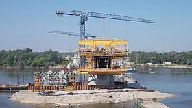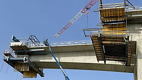 - Le unità cantilever con scorrimento dal basso possono essere adattate a vari tipi di ponte, ad esempio strutture ad arco e strallate, senza ostruire i cavi temporanei o permanenti.