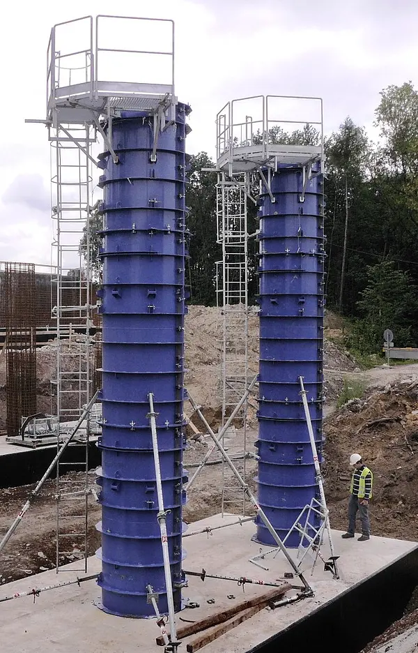Formy stalowe umożliwiające deskowanie słupów o przekroju kołowym bądź owalnym z systemowymi pomostami i drabinami. Sprawdzają się zarówno na obiektach kubaturowych, jak i infrastrukturalnych.