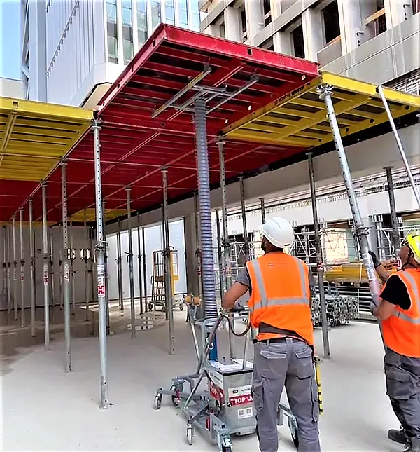 Die Positionierung der Deckentische nimmt im Vergleich zu anderen Deckenschalungssystemen in der Regel weniger Zeit ein, da pro Tisch große Flächen abgedeckt werden können. Allerdings wird ein Kran oder Umsetzwagen benötigt, um die Deckentische anzuheben. Sie helfen außerdem dabei, die Deckenstützen an den Tischen zu befestigen. Diese sind wiederum notwendig, um die Last des Betons zu tragen und die Deckentische ausreichend zu unterstützen. Aufgrund der Größe der einzelnen Tische lassen sich die Kranzeiten stark reduzieren. Dementsprechend wird der Kran schnell wieder frei und kann anderweitig eingesetzt werden.