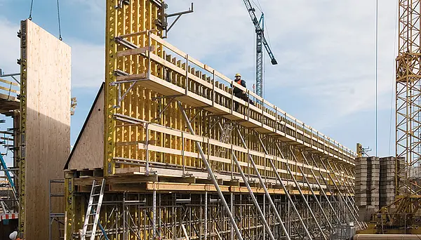Für eine Großflächenschalung mit hoher Effizienz ist diese Schalungslösung ideal. Das optische Ergebnis der Betonoberflächen kann stark von den jeweils verwendeten Wandschalungen abhängen. Je nachdem, wie hoch die Anforderungen an den Sichtbeton sind, sollten die Systeme entsprechend ausgewählt werden.